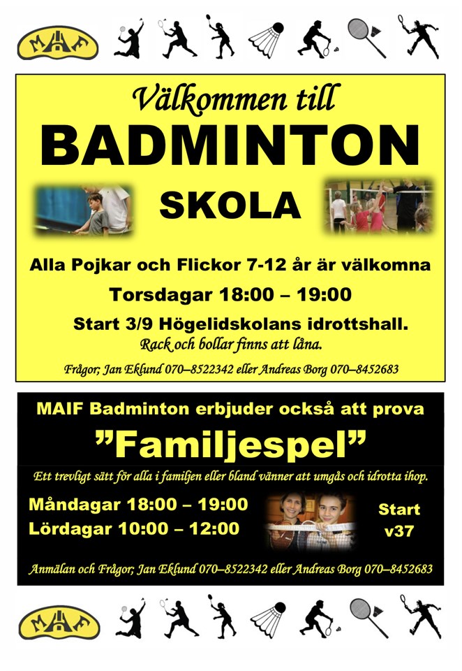 Maif Badminton välkomnar barn 7-12år att börja i badminton-skola. Torsdagar 18:00-19:00 Högelidshallen. .....eller anmäl er till ”familje-spel” umgås och idrotta ihop 😊👍 Hoppas vi ses!